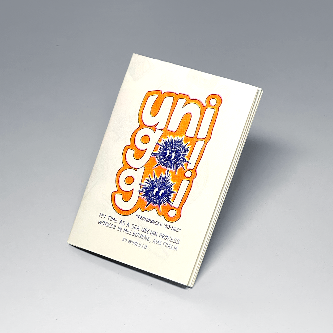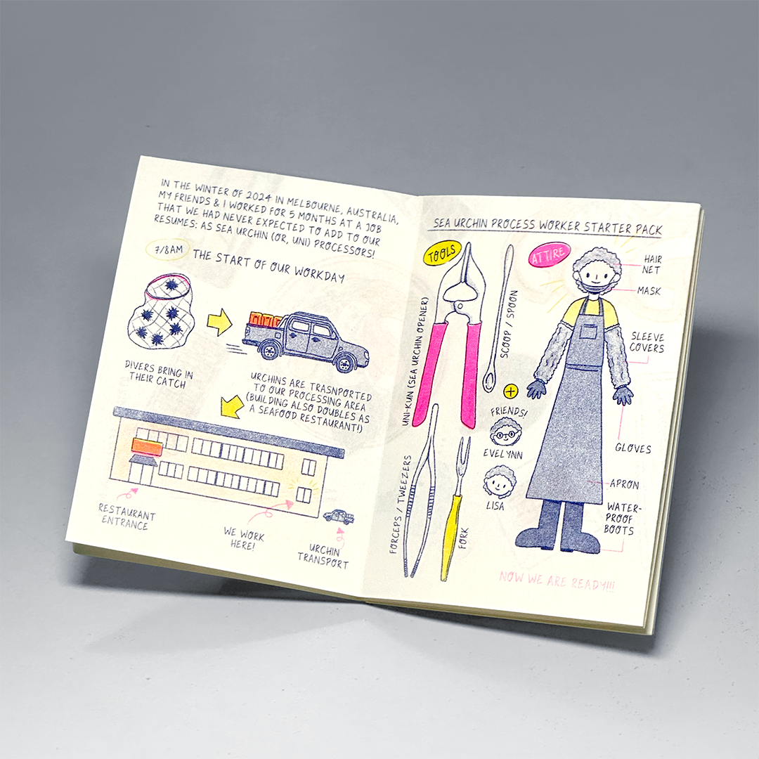 A playful documentary zine capturing the author’s experience as a sea urchin process worker in Glen Waverly, Melbourne. Growing up in Singapore—where sea urchins are prized but never farmed—the artist shares a first-hand look at how these delicacies journey from sea to plate. Part journal, part manual, Uni GO GO! offers a light-hearted glimpse into an unusual job few in Singapore have experienced.