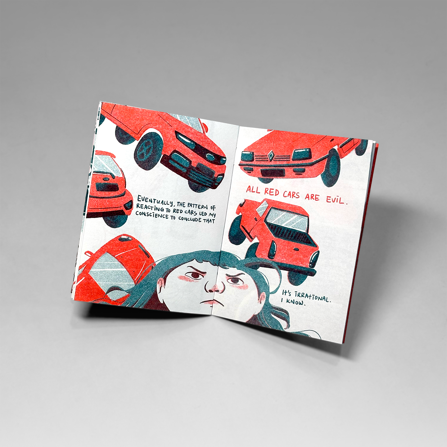 Seeing RED starts with something simple, a colour, but quickly spirals into something more charged. What begins as road rage shifts into a reflection on bias, where “seeing red” becomes both emotional and symbolic. Through sharp contrasts of red and teal, this zine unpacks how meaning, hatred, and perception are constructed, before gently reminding us that, at its core, red is still just a colour.